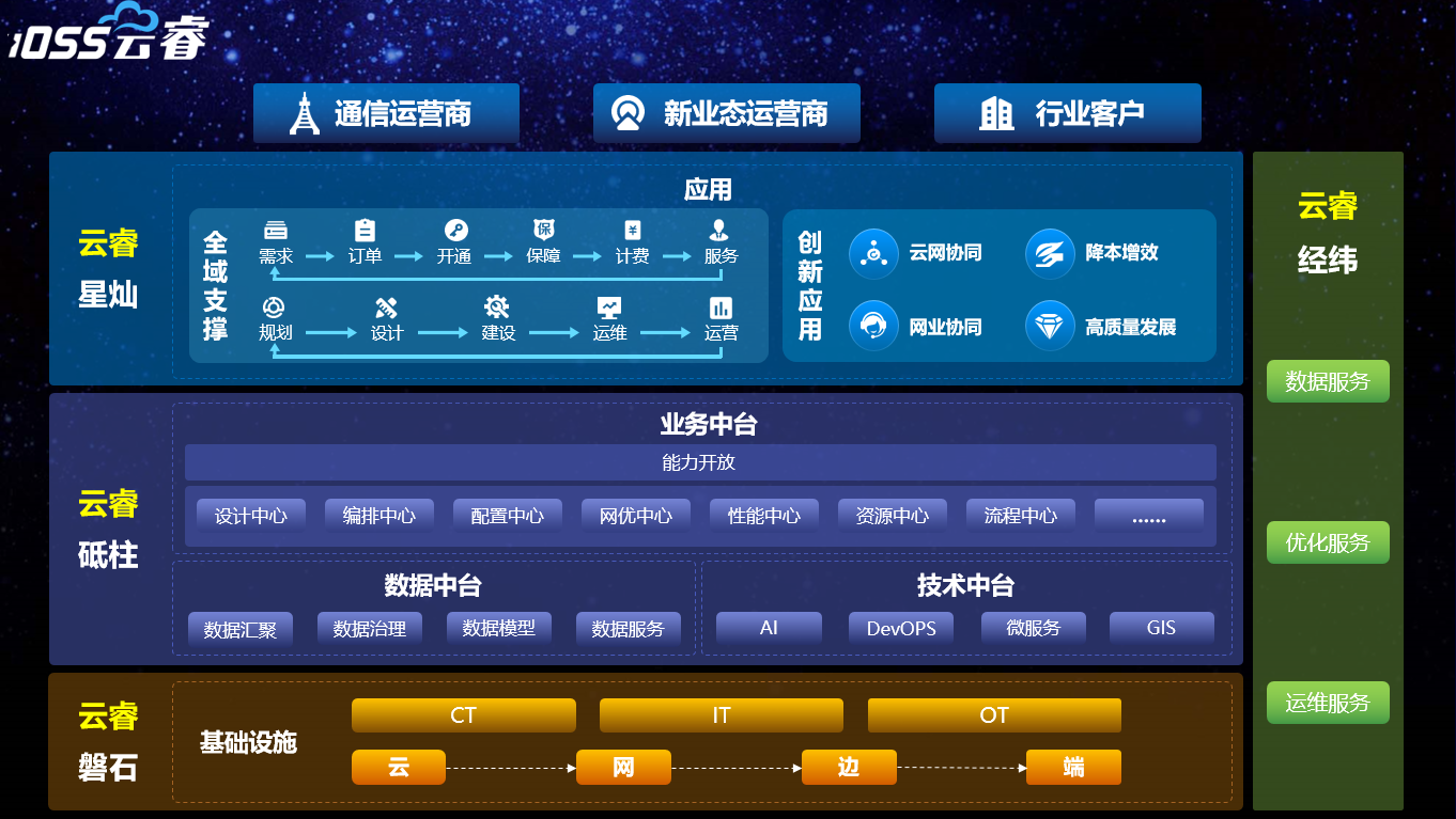 凯发K8国际iOSS云睿4大方向:云睿磐石、云睿砥柱、云睿星灿、云睿经纬,包括但不限于数据中心基础设施管理(DCIM)系统解决方案,智慧中台解决方案,基础FCAPS能力(资产管理、故障管理、性能管理、优化管理)及质效运维、电子运维、代维管理、能耗管理、指挥调度、智能运维、成本管理、费用稽核等系统解决方案,家集客解决方案,新业务支撑(5G业务设计、编排、保障管理)解决方案,云网融合服务解决方案,能力开放解决方案,运维服务解决方案等等。