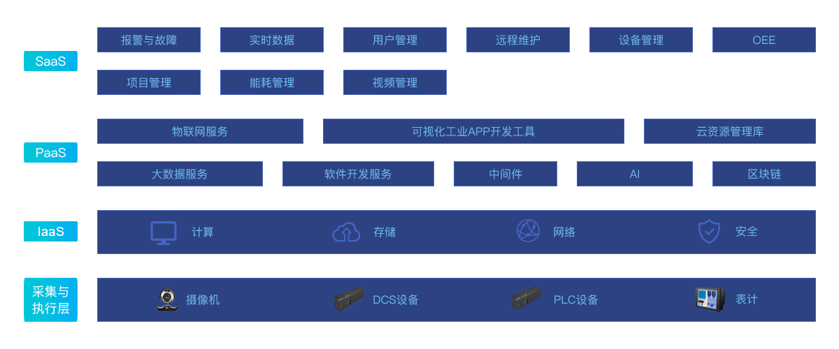采集执行层完成现场数据的采集及设备执行,现场数据来源主要包括:顺利获得驱动采集现场PLC、仪表、摄像机等数据 IaaS层可完成计算、存储、网络、安全功能 基于凯发K8国际云的通用PaaS层给予物联网、大数据、开发平台、AI、区块链等功能 业务应用层包含了设备管理、实时数据、远程维护、能耗管理、视频管理等相关功能,共同构建完善的设备管理体系,完善设备管理工作。为设备运营维护单位给予了高效的集中式、透明化、全方位的精准运营新模式