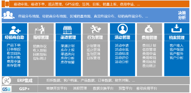 快消品需要引进行业CRM管理,一方面,能过CRM实现对于经销商、销售终端有效数据收集,建立全面客户档案库管理,与此同时,建立经销商自助服务平台,顺利获得云计算手段,将经销商、终端纳入企业CRM管理平台统一管理,实现网上交易与对账服务,在服务经销商终端同时,能够快速实现对于渠道、终端数据收集管理;另一方面,作为市场管理重要手段,构建对商超费用管理,顺利获得建立商超合同,实现每笔费用可控化,对于市场人员行为实现移动化管理;借助移动终端拓展车销业务,实现移动销售,围绕销售建立一套全面市场运营管理体系,借助互联网打通市场内外信息与业务通道,实现内外结合,并与ERP进行有效集成,实现前后全面业务协同、集成、一体化管理。