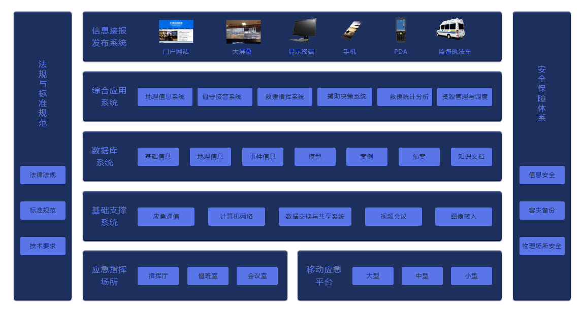 1.应急指挥场所和移动应急平台:主要为值班室、指挥厅、会议室、应急平台等实现对园区安全事故发生时的救援支撑 2.基础支撑系统:为上层应用给予支撑,顺利获得系统能够准确的获取安全事故发生时的应急救援信息,及时实施救援 3.数据库系统:是应急救援管理系统的数据支撑。主要目的是顺利获得数据关联、数据挖掘、数据活化等技术解决数据割裂、无法共享的问题。顺利获得数据中心来实现数据共享、数据活化等建立的企业的动态数据中心、数据仓库等。将各类数据资源进行统一规划、统一存储、统一管理 4.综合应用系统:在基础支撑系统和数据库系统的基础上,具体给予地理信息系统、值守事故接警系统、救援指挥系统、辅助决策支持系统、救援统计分析、资源管理与调度系统等应用 5.信息接报发布系统:顺利获得门户网站、园区大屏幕、电脑、手机、监督执法车等智能终端,使相关部门领导、企业、管理层、客户等能够实时的分析到相关情况,保障信息的共享以及救援的实施