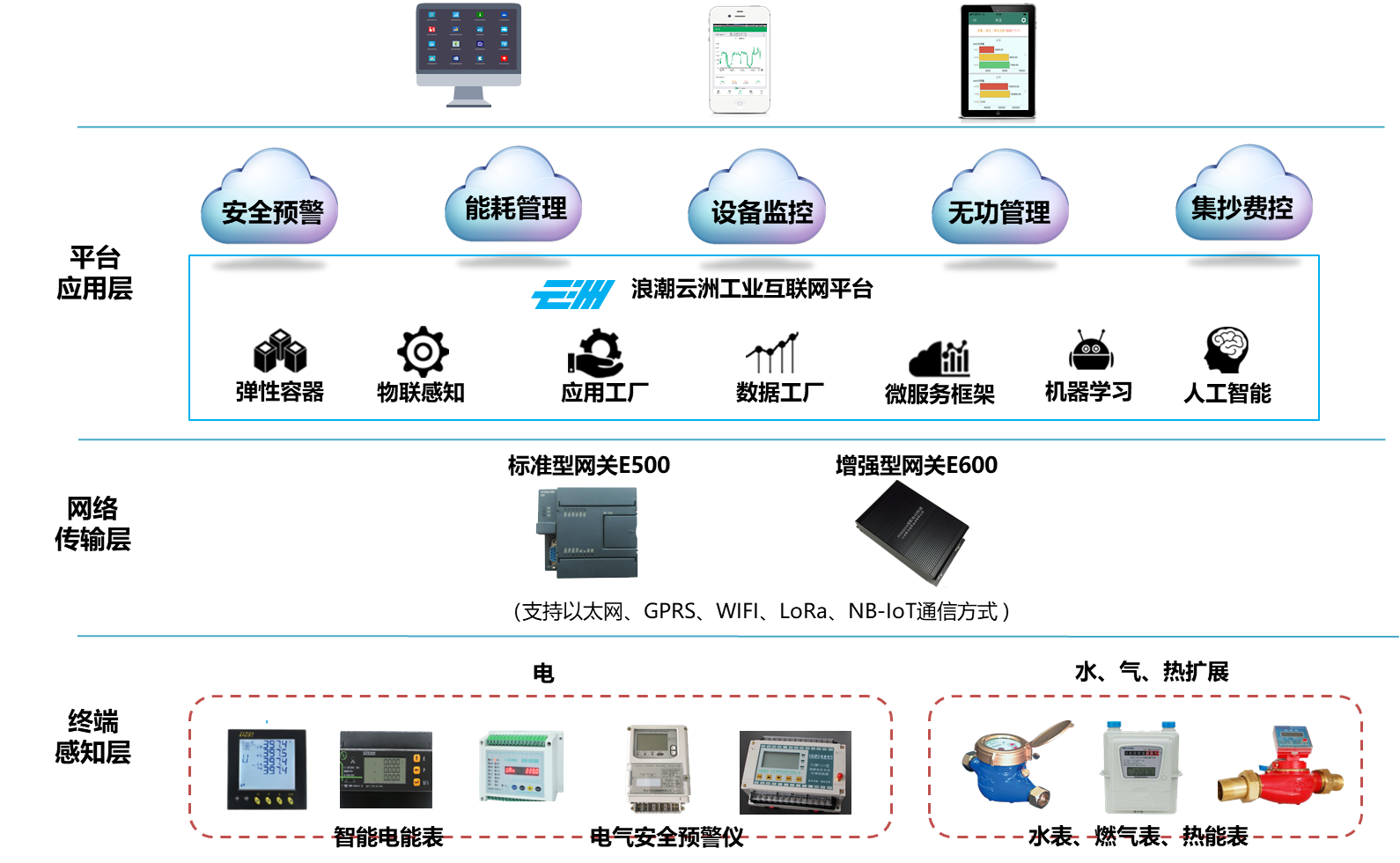 智慧能源管理业务主要包括如下类别:安全预警、能耗管理、设备监控、集抄费控,图为业务架构 终端感知层给予主要是现场的水表、燃气表、热能表,以及安装在现场的智能电表、电气安全预警仪等 网络传输层主要是指给予工业网关,负责终端智能表计与平台应用层的连接,实时采集设备数据,上报到云上的物联网服务 平台应用层基于凯发K8国际云洲工业互联网平台搭建,给予面向能源管理领域的特定场景应用。平台给予虚拟化、物联感知、应用工厂、数据工厂、微服务、机器学习、人工智能等服务能力,支撑智慧能源管理应用 应用层给予安全预警、能耗管理、设备监控、无功管理、集抄费控等功能,服务安全用能、经济用能以及精细化管理的需求,同时支持PC端和移动端(IOS、Android)访问,满足不同用户群体使用需求
