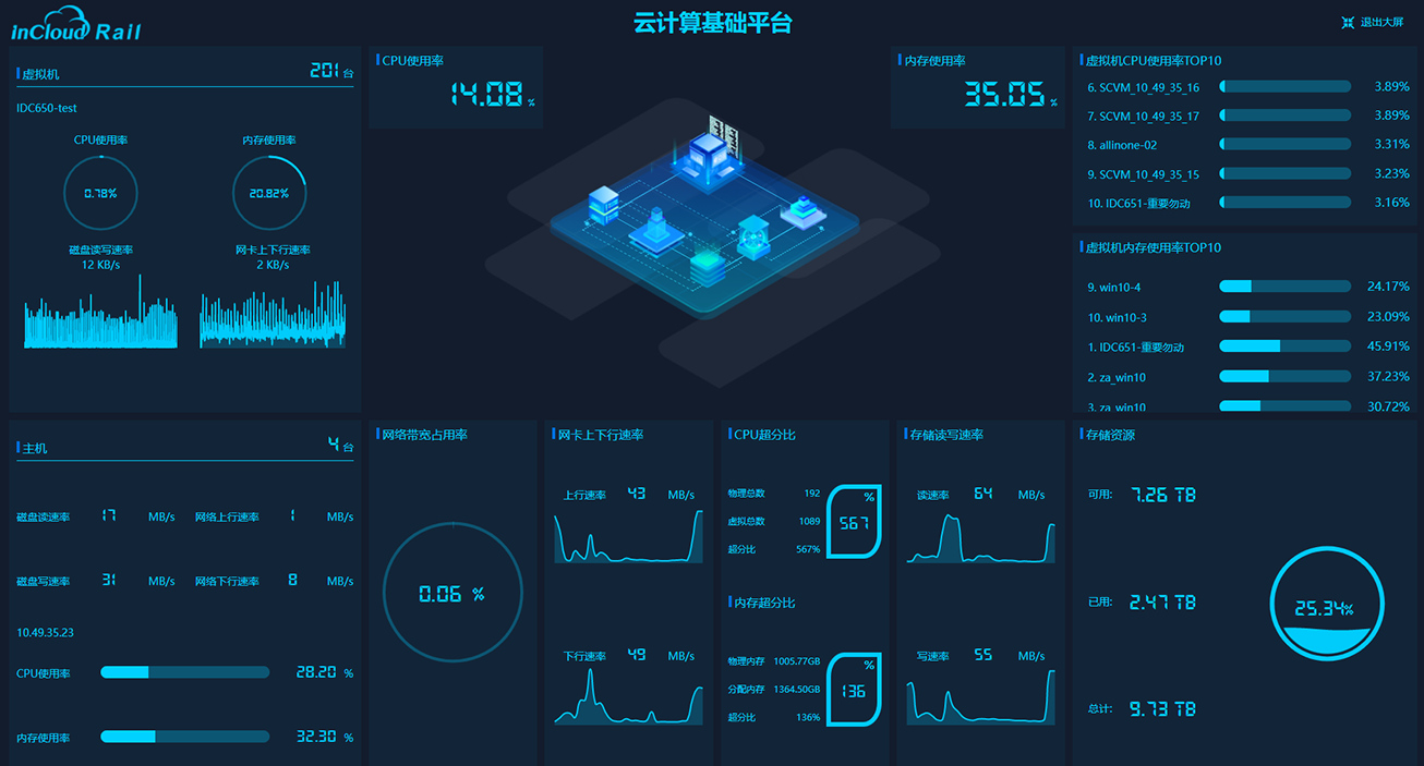 | 计算虚拟化 | 采用自主研发、基于 KVM 深度定制的计算虚拟化软件 InCloud Sphere,支持资源预留、热添加、GPU 直通、vGPU、USB Over IP、 DRS、DRX、裸机管理、虚拟录影机、磁盘双活等多种高级特性 |