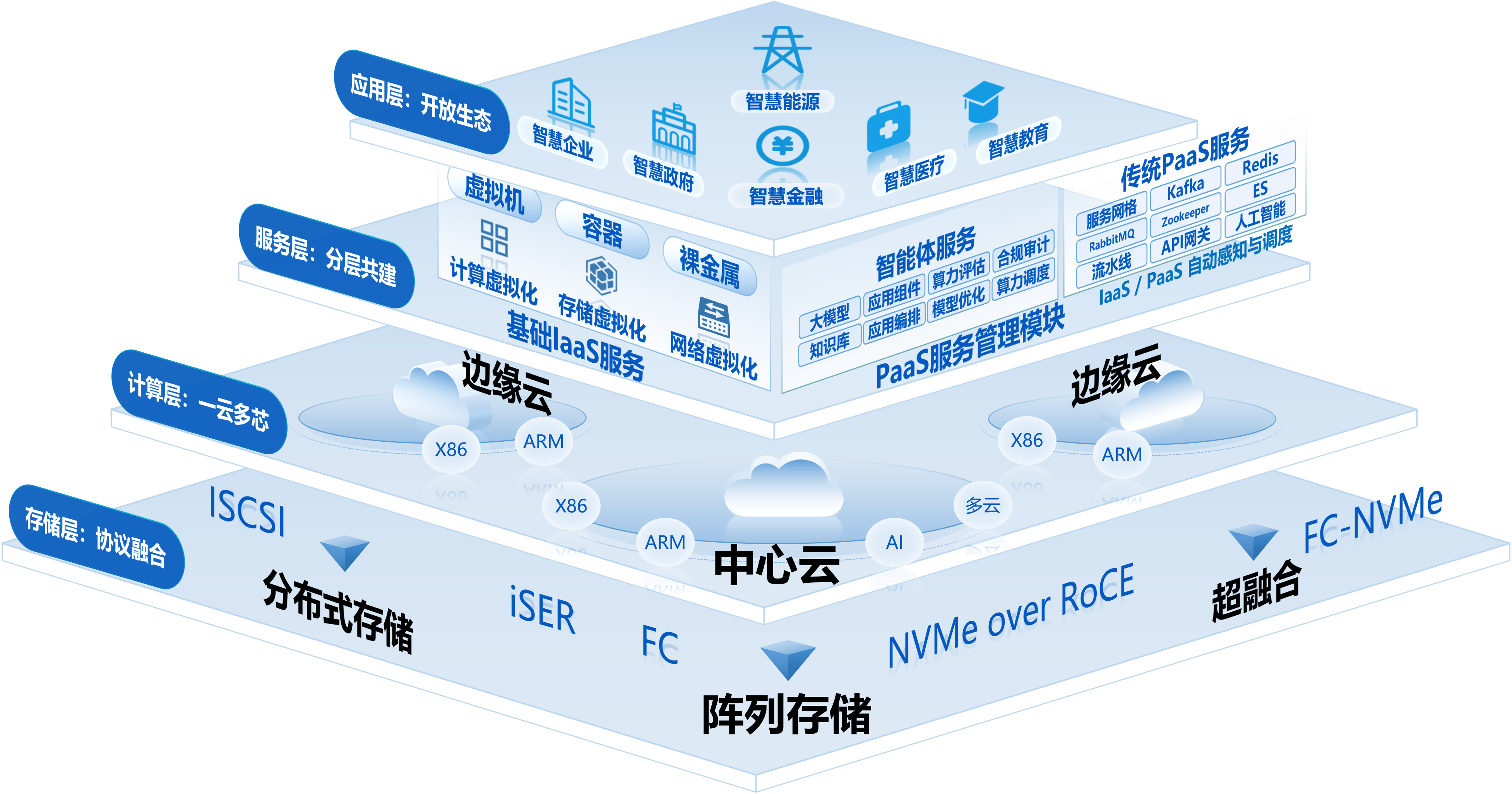 新一代私有云建设框架,可为用户给予自助式一体化的极简运维体验,给予丰富的PaaS云服务能力,统一管理视图监控一云多芯、软硬融合、云数智融合的私有云环境,缓解运维压力,提高管理效率。